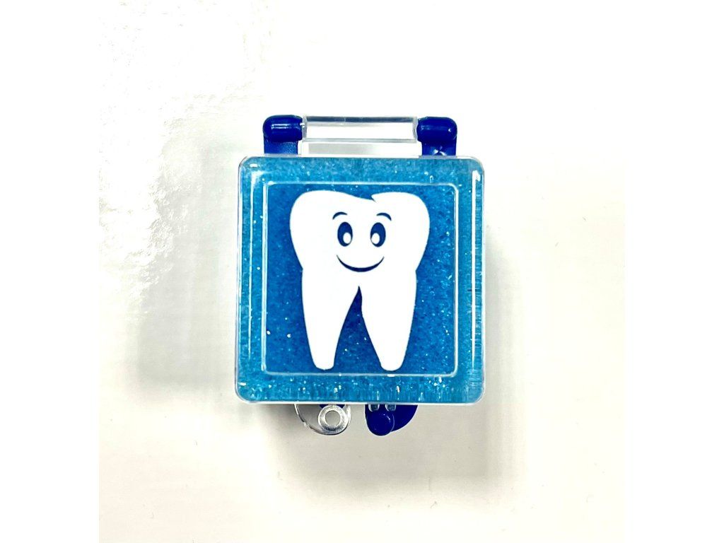 Malá plastová krabička s polyesterovou výplní s bílým potiskem zoubku.